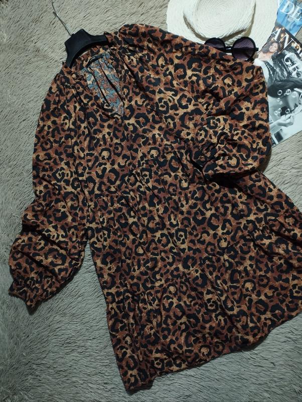 В отличном состоянии. Красивое ярусное платье леопард с объемными рукавами. Тканина легка, не тягнеться. Размер 18/46/3XL, но смотрите по замерам Замеры (полуобхват): Груди 59 Талия 53 Рукав от горловины 72 Стегна 70 Длина от горловины 91