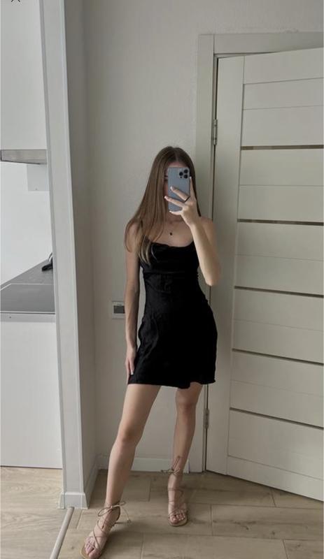 Чорна сукня, міні з відкритою спиною. Шикарна тканина додає вартості. Підходить на розмір-XS/ S/M зав‘язками регулюється Одягнена на параметри талія 62,стегна 83, груди 78, зріст 168см