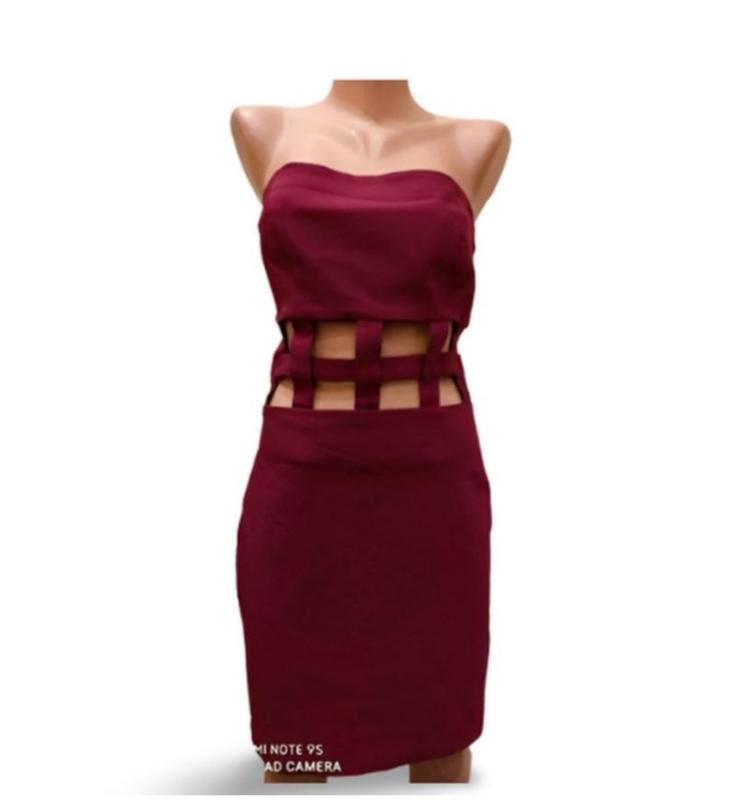 Це смілива, сексуальна та сучасна чорна сукня, ідеальна для вечірок чи клубних виходів. Колір: Бордо Силует: Обтислий, бандо (без бретелей), Деталі: Верх (Ліф): Прямий або злегка вигнутий виріз декольте, що повністю відкриває плечі та ключиці. Ліф щільно прилягає до грудей. Особливість (Вирізи): Головною особливістю сукні є горизонтальний виріз на талії (або трохи вище талії). Цей виріз розділений тонкими вертикальними та горизонтальними смужками тканини, створюючи ефект «Cage-Cutout» або «Cage Mesh» (сітка/решітка). Це елемент, що привертає увагу, який підкреслює талію і робить образ дуже відкритим. Спідниця: Спідниця-футляр, обтисла. Проста і лаконічна, що балансує сміливість вирізів. Тканина яка забезпечує щільне прилягання та добре тримає форму. Сукня є втіленням гламуру вечірок. Вона виглядає провокаційно та трендoво, призначена для створення ефектного образу. 62% бамбук 33% полиэстер 5% еластан Колір бордовий і чорний Є підкладка, спинка на змійці BSB COLLECTION