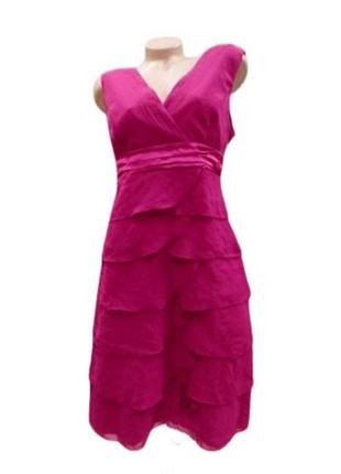 Великолепное яркое малиновое (фуксия) платье с ярусной юбкой и V-образным вырезом. Цвет: Насыщенный, яркий оттенок малинового или фуксии. Фасон: коктейльное или праздничное платье Верх: Вырез: Глубокий V-образный вырез спереди. Рукава: Без рукавов, на широких бретелях. Лиф: Облегающий, с запахом или имитацией запаха, создающей драпировку и подчеркивающий талию. Талия: завышенная или природная, выделенная вшитой (или имитированной) широкой лентой/поясом из того же материала, что и зрительно стройнит. Юбка: Тип: Ярусная (каскадная) юбка. Детали: Состоит из нескольких горизонтальных слоев-воланов с закругленными краями, которые придают объем и легкость. Платье создает яркий, женственный и игривый образ.