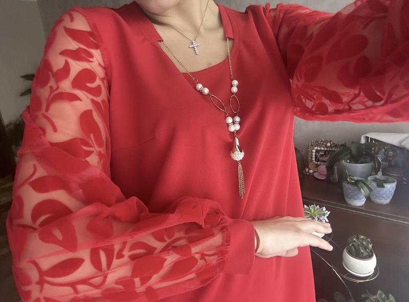 Яскрава червона сукня в розмірі 50,нова з етикеткою,заміри: пог-52см,пот-51см,поб-55см,довжина 102см,сукня добре тягнеться.Камера не передає колір,колір насичений червоний.