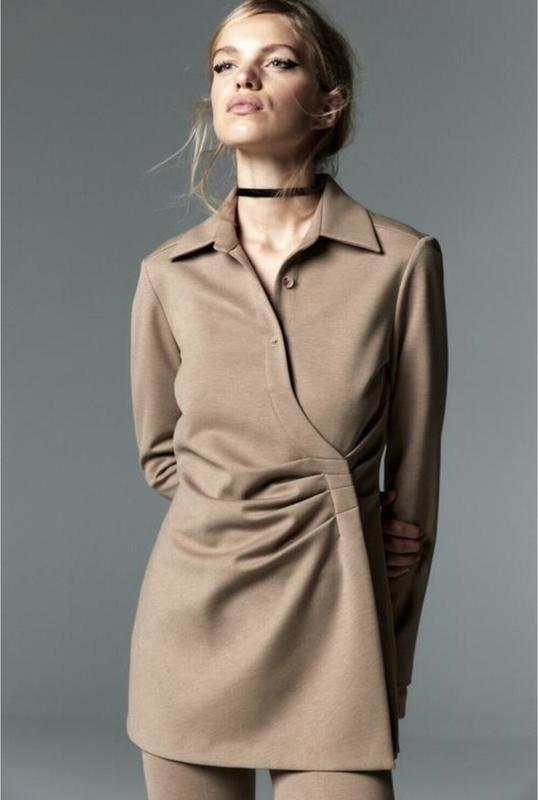 жіноча сорочка-сукня кольору хакі або тауп з довгими рукавами та драпіруванням спереду Zara Пог-49 см Пот-39 см Поб-50 см Довжина-74 см Довжина рукава-59 см Збоку змійка