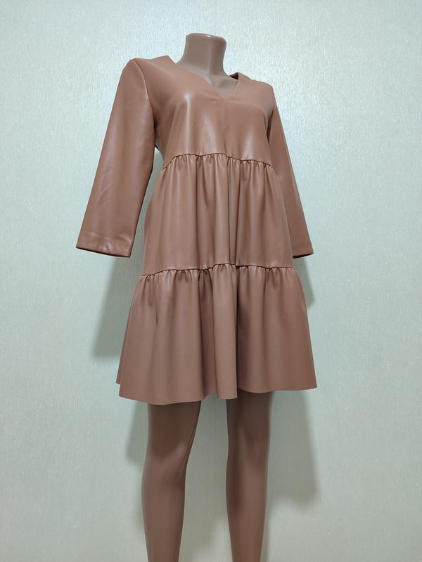 Секонд высокого класса, стильные и качественные вещи известных брендов. Фирменное стильное платье из искусственной кожи с модным и стильным дизайном, легкое утепление, слегка стрейч. Заміри на фото.
