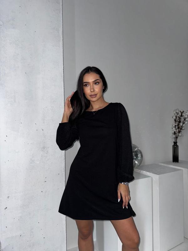 Платье черное женское #171/173 Комфортное универсальное платье из креп-дайвинга с легким мерцанием люрексовых рукавов. Мягкая ткань не обтягивает и красиво ложится по фигуре, подходит для ежедневного использования и праздничных событий. Модель подходит для женщин разных параметров, в том числе для тех, кто ищет женскую одежду больших размеров. Характеристики: • Ткань: креп-дайвинг, люрекс • Цвет: черный • Размеры: 42-44, 46-48, 50-52, 54-56 • Подойдет для: офиса, праздников, встреч, повседневных образов