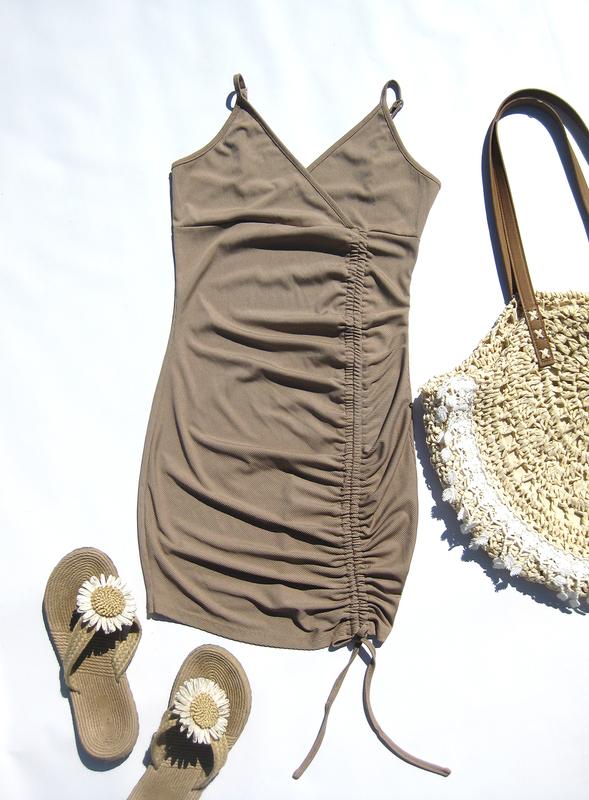 Модное летнее облегающее платье какао в рубчик с драпировкой оборками shein