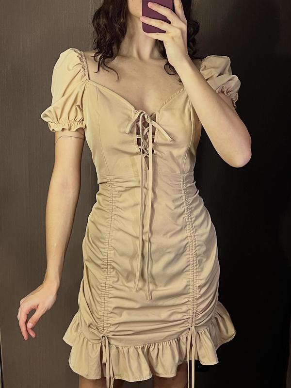 Красивезна сукня від Pretty Little Thing з завʼязками. Рукава на резиночках, бюст регулюється шнурівкою. Довжина спіднички теж регулюється затяжками. Ззаду на змійці На фото одягнено на зріст 175, ОГ 88, ОТ 70, ОБ 93 (ВЕЛИКА! Див. останні фото) Заміри: Між плечима 34 Під пахвами 49 Талія 41 Стегна 50 По низу 52 Пройма 24+ (резиночка) Довжина повністю 85