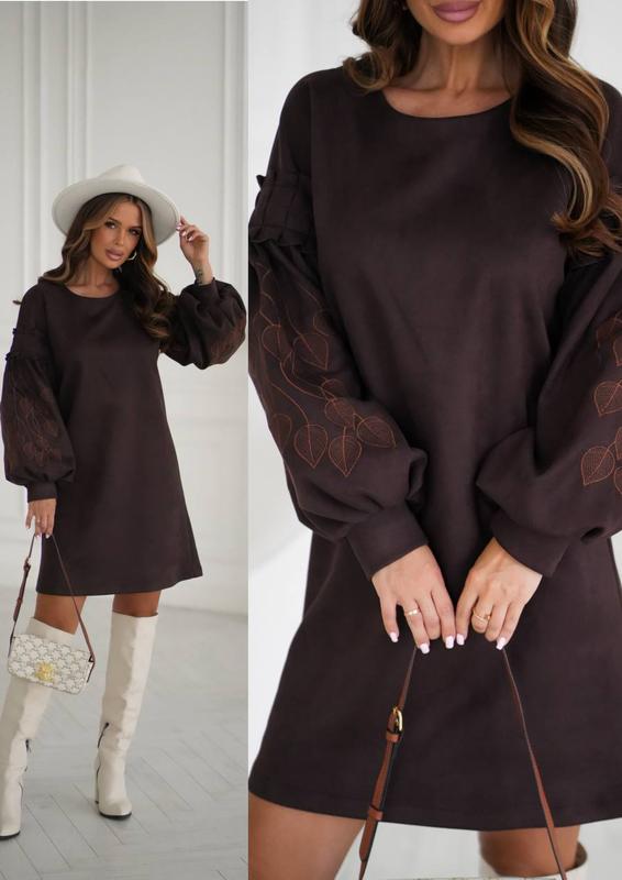 Замшевое платье с вышивкой на рукавах 7562 Размер: S-M(42-44), L-XL(46-48), XXL-3XL(50-52) 💥Цена- 1.149 грн 🔥 Замеры на последнем фото с Ткань: замш на дайвинге + вышивка Длина: 88 см Кольори: шоколад, черний, беж, капучино ____________________ Платье прямого кроя с акцентом на объемных рукавах. Длина выше колена делает силуэт легким и современным, Рукава с деликатными складками и изысканной вышивкой в виде листьев создают утонченный акцент и подчеркивают индивидуальность образа. Идеальный выбор для тех, кто ценит минимализм с ноткой оригинальности.