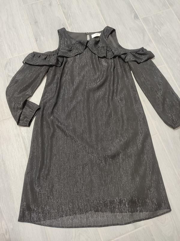 Платье черного цвета, плечи открытые, размер М, состояние идеального. Очень красиво блестит.