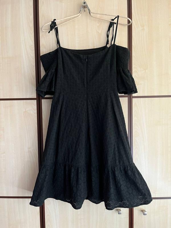 Платье люксового бренда из черного коттона с прошвой. Подкладка коттоновая. Состояние новой вещи. Плечи открыты. Верхние бретели завязывается, ими можно регулировать длину. Длина без верхних бретелей 72 см, с бретелями еще плюс примерно 12-17 см. По рукава жатка, на любой обьем руки, также за счет нее регулируется ширина по плечам. По талии 34, по бедрам 47. Отличное качество ткани и пошива