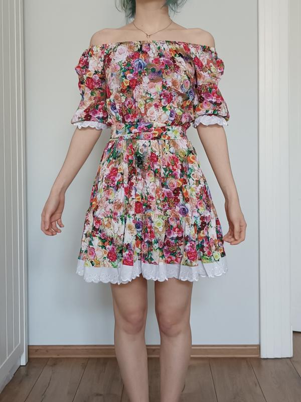 Платье в цветочный принт. Бирка на шее срезанная, однако приобретается платье в OLKO. Надела ее один единственный раз на свой выпускной с 9 класса. У горловины резинка, поэтому на плечах, если поднимать руки, она будет держаться не будет. Но на фото красиво. По желанию можно вырезать резинку и реорганизировать пояс в бретели. Состав: 100% хлопок, очень-очень мягкая на ощупь, не просвечивается. Все белые частицы платья чисты и незагрязнены. Есть два функциональных кармана. Замеры человека на фото (платье сидит "впритик", на больший размер не уйдет, разве только на меньший): Рост: 168 см Обхват грудей: 85 см Обхват талии: 68 см Обхват стегон: 93 см Пишите по любым вопросам.