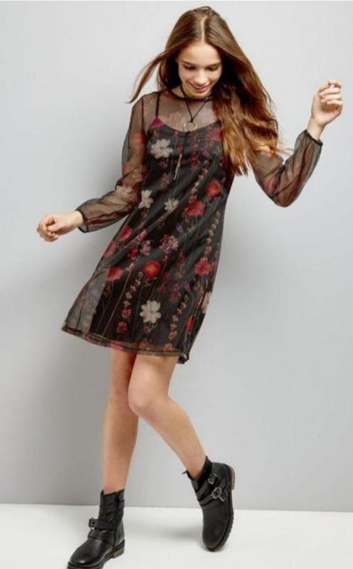 НОГ 40-48 по підкладу, пог 48 по платтю. Підкладка має по спинці гумку та регульовані бретелі піт 42, б 52, рукав 59, довжина 88, верх поліестер 💯, Підкладка віскоза 💯, розмір вказаний 10. Фасон/Крій: Це двошарова сукня. Нижній шар: Коротка чорна сукня або комбінація на тонких бретелях. Верхній шар: Напівпрозора або прозора сукня-сорочка (туніка) з довгими рукавами, одягнена поверх. Колір і Принт: Чорний напівпрозорий фон з яскравим квітковим принтом (переважно червоні, бордові та білі квіти).