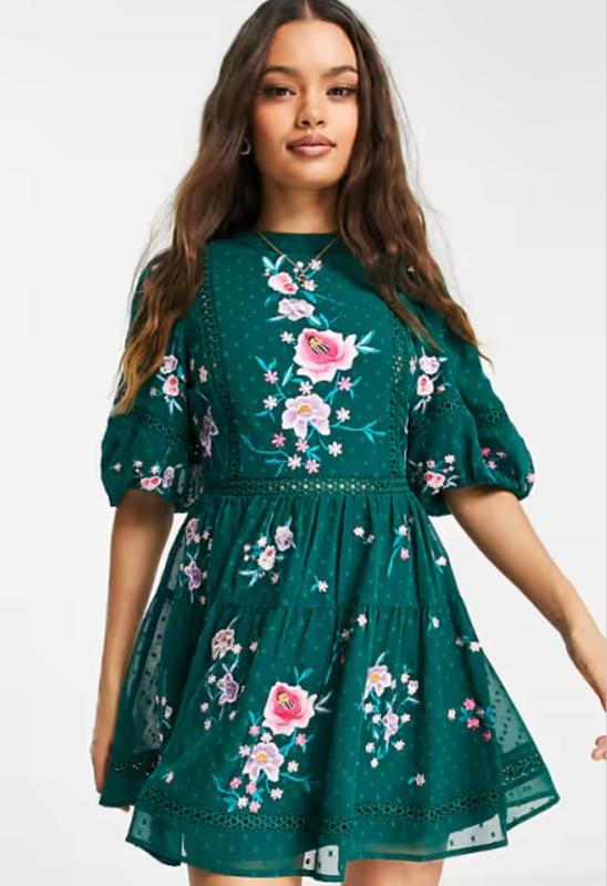 Шифоновое мини платье с вышивкой, на подкладе, с объемными рукавами, плечи 36, ПІГ 46-47, ПИТ 37-38, ПИБ по подюбнику 55, рукав 31, длина изделия 82.