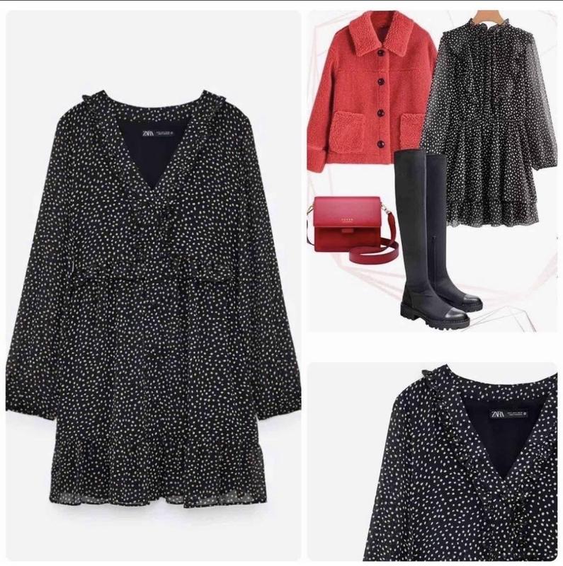 New collection! Розкішна чорна сукня в горох від Zara. Сукня з V-подібним вирізом і довгими з легкими об'ємними рукавами. На рукавах манжети з ґудзиками, по талії йде рюшико, що візуально виділяє талію. По всій довжині сукні є ґудзички. Сукня повітряна, легка, дуже красива, якість шикарна, як і вся Zara. Ціна Дивіться всі мої оголошення є багато фірмових речей!