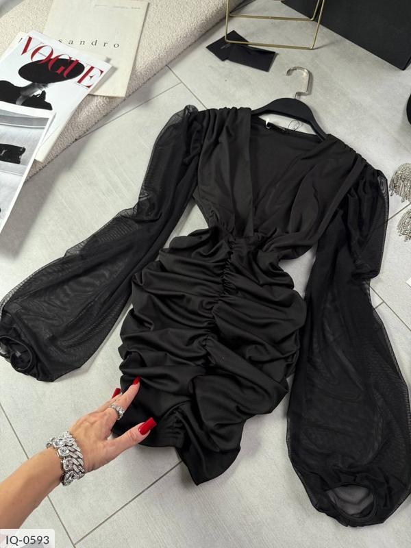 Платье IQ-0593 Мод.759 Размеры: 42-44, 46-48 Цена 1690грн. Ткань: микро дайвинг+стрейч сетка Цвет: черный Посадка: приталенная с драпировкой. Длина: мини Цвет: глубокий черный сидит идеально на любой фигуре.