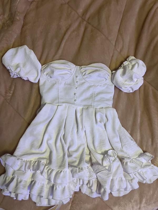 Акцент на талії: Корсетний крій ліфа з декоративними ґудзиками створює осину талію. • Регульована посадка: Завдяки шнурівці-корсетові на спині сукня сідає ідеально. • Стиль: Модний фасон з об'ємними рукавами-ліхтариками (можна носити як бандо з відкритими плечима або як сукню без рукавів). • Тканина: Легка, жата (крепова) текстура, ідеально для спеки.