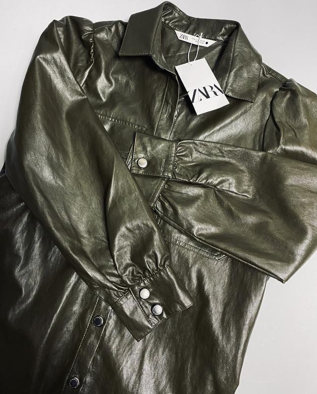 Очень крутое стильное платье в модном фасоне, красивый насыщенный цвет хаки, мягкая качественная плотная эко-кожа, на вид и прикосновение - как натуральная, качественная фурнитура, новое с бирками Можно создать много образов, подойдет под юбки, брюки, плотные колготки, ботфорты, высокие сапоги, можно носить просто как рубашку накидку...