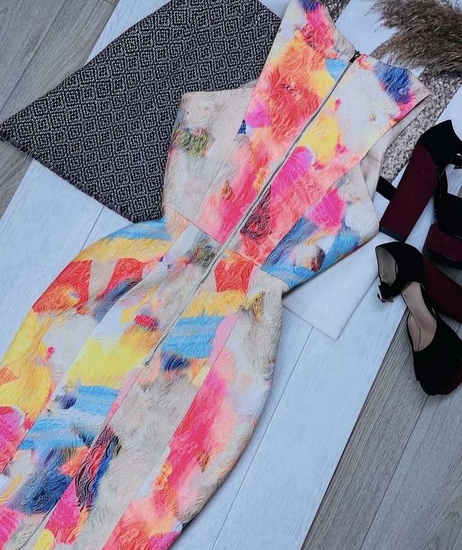 🌿Різнокольорова фактурна сукня футляр H&M Розмір:S Склад:78%поліестр,16%бавовна,5%візкоза,1%еластан Стан:5/5 Особливості:на підкладці,золотиста фурнітура Заміри(від шва до шва): Від бретелі до бретелі 27 По спинці 95 ПОГ 39 ПОТ 35 ПОБ 43 По низу 40