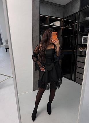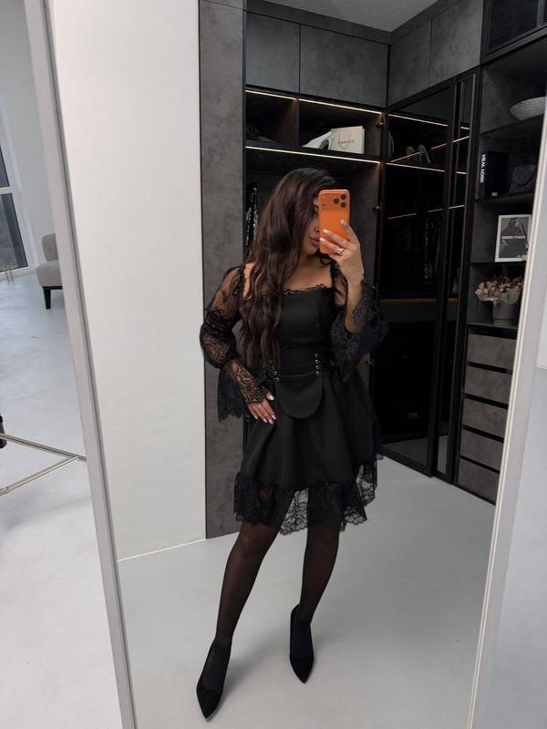 Сукня з ажурним гіпюром Модель 3019 ▫Тканина: костюмка + гіпюр ▫Розмірний ряд: 42-46, 48-50 ▫Колір: чорний та білий 🏷 1050 грн Фото реал Чорна сукня, яка створена для тих, хто любить ефектні образи🤩 Ажурні прозорі рукави додають легкості й романтики, а мереживна обробка по краю робить силует ще більш вишуканим. Верх і корсетна зона красиво підкреслюють фігуру, створюючи акуратний акцент на талії🖤