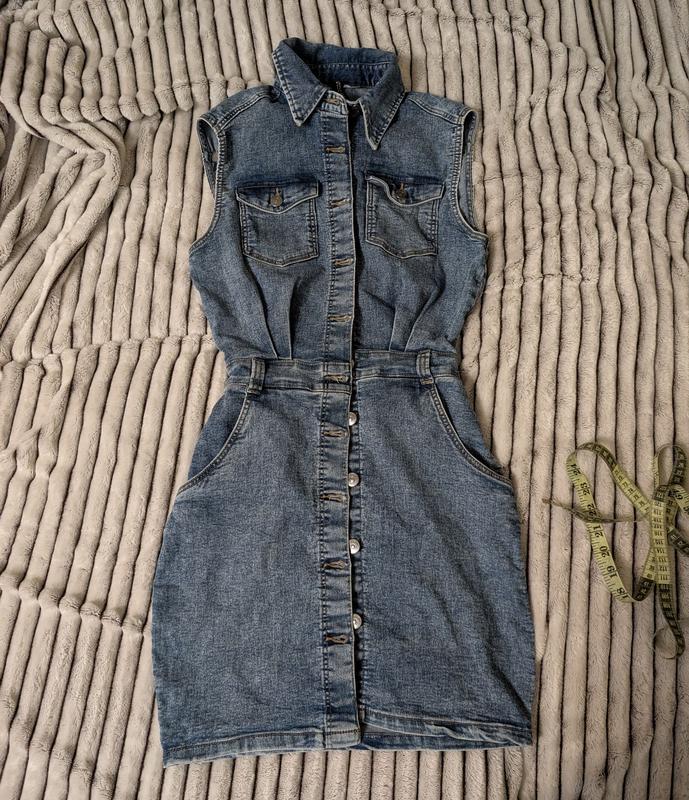 Отличное джинсовое платье, можно одевать под тонкую кофточку. На рост до 170 см. ПОГ 36 см. ПОТ 34 см (резиночка, поэтому и на 30 см садится). ПОС 40 см. Длина платья 85 см.