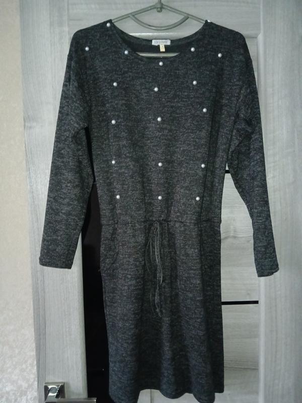 тепленьке плаття з перлинами графітового кольору, з кишенями, розмір с-м, тканина тягнеться, талія на резинці