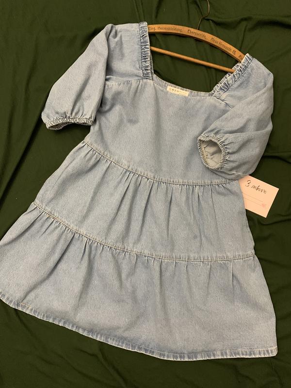 Легка та зручна сукня з м’якого деніму в світло-блакитному кольорі. Модель з об’ємними рукавами на резинці та квадратним вирізом. Має вільний фасон з двома ярусами, що гарно сідає та не обмежує рухи. Стан: нова Матеріал: легкий тонкий джинс (бавовна) Довжина: коротка / вище коліна. •