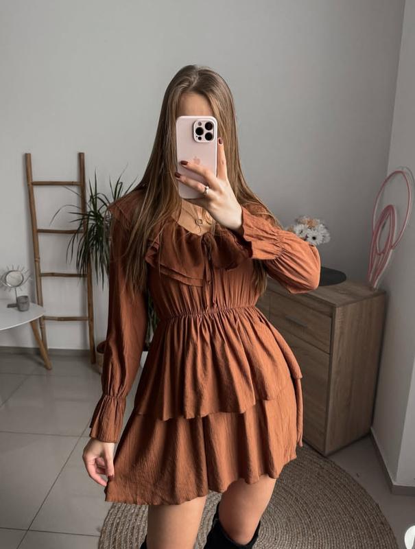 Ярусное платье из жатой ткани. Цвет кирпичная. Размер S: рукав от горловины 68, пог до 47, в бедрах свободная, длина 85.