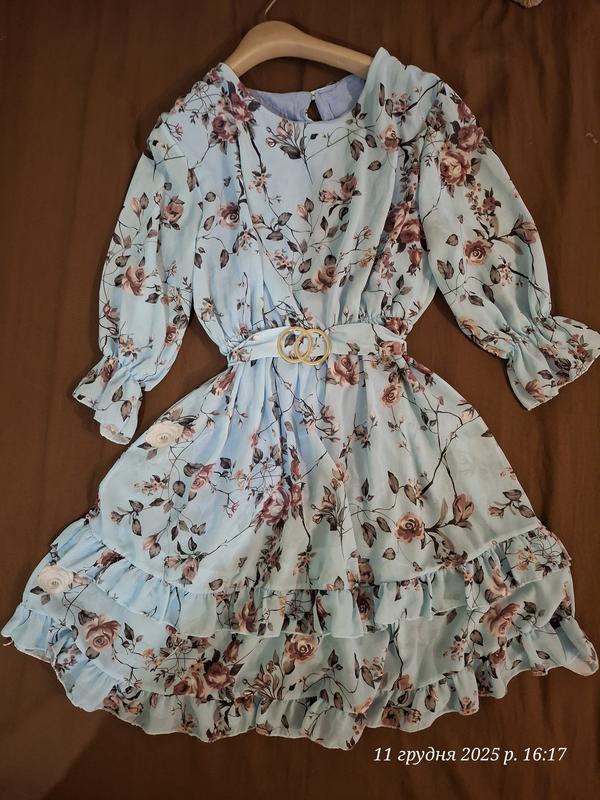 Платье в хорошем состоянии, голубое с цветочным узором, имеет зади застежку и поясок на талии. размер S/M