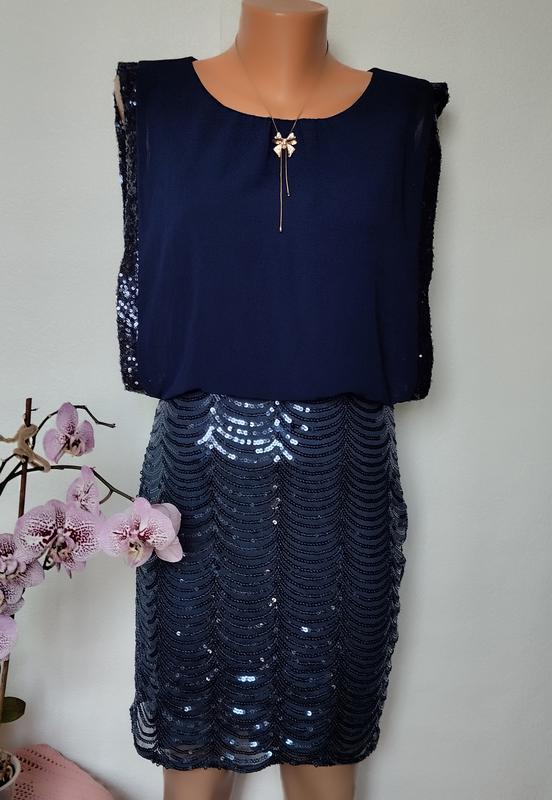Нереальное бомбежное праздничное платье, украшенное пайетками. 😍 Размер указанного евро 40, но на Л будет очень в утяжелителе, лучше на С-М, смотрите замеры: длина 88 пог 46-48 пот 38-40 пос 44-48.