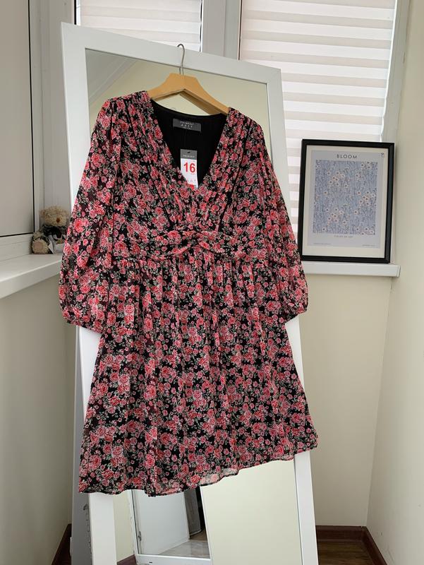 Платье размер XL 16, можно на L Полуобхват груди 52 см Полуобхват талии 44 см Есть подкладка не просвечивается Сбоку на замочке Длина 93 см Рукав 51 см Плечи 38 см Материал: полиэстер
