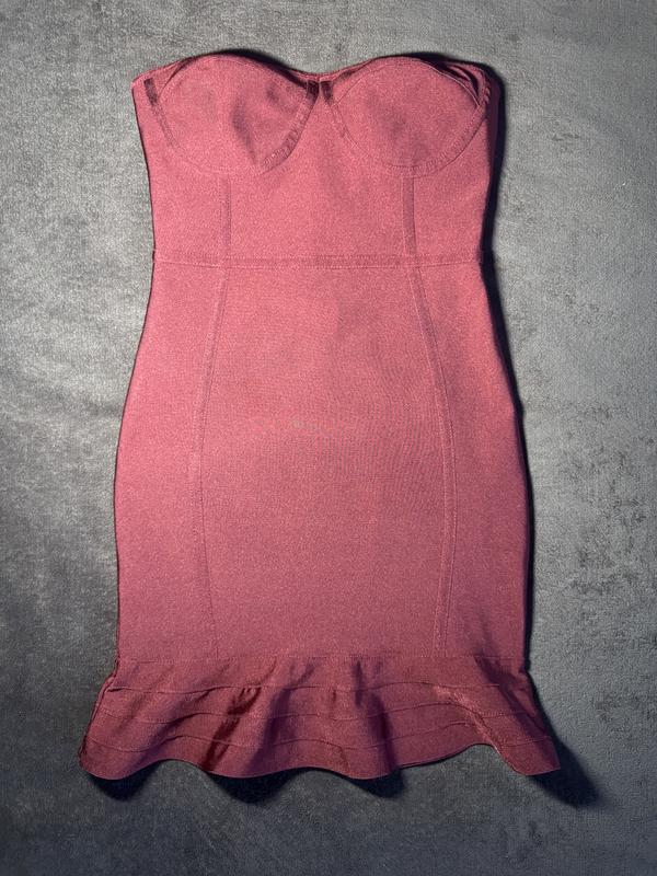 Бандажна сукня кольору бордо. Розмір 34. Зверху чашки прорезинові, чашка В. Внизу сукня йде баскою. Довжина - 64 Напів обхват грудей- 37 Напів обхват талії- 30 Напів обхват в бедрах-38