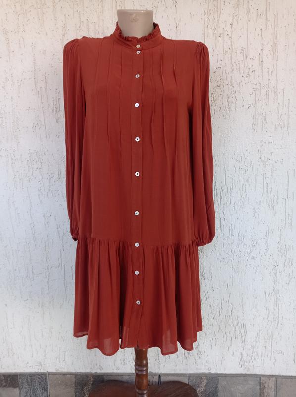 Стильное платье терракотового цвета, из вискозы на подкладке в идеальном состоянии. Замеры: длина 85, полуобхват груди 48, плеч 36, рукав 56.