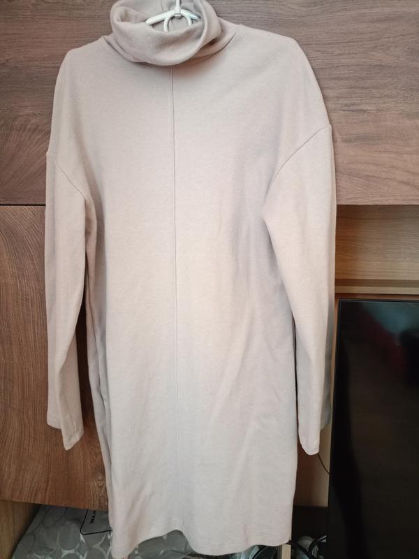Сукня розмір S Прямого крою, можна на розмір М Горловина стійка Декоративний шов спереду Тканина плотний рубчик Колір капучино Довжина спереду від горловини по шву 80 см Пог 48 Пот 44 Пос 48 Виробництво Україна
