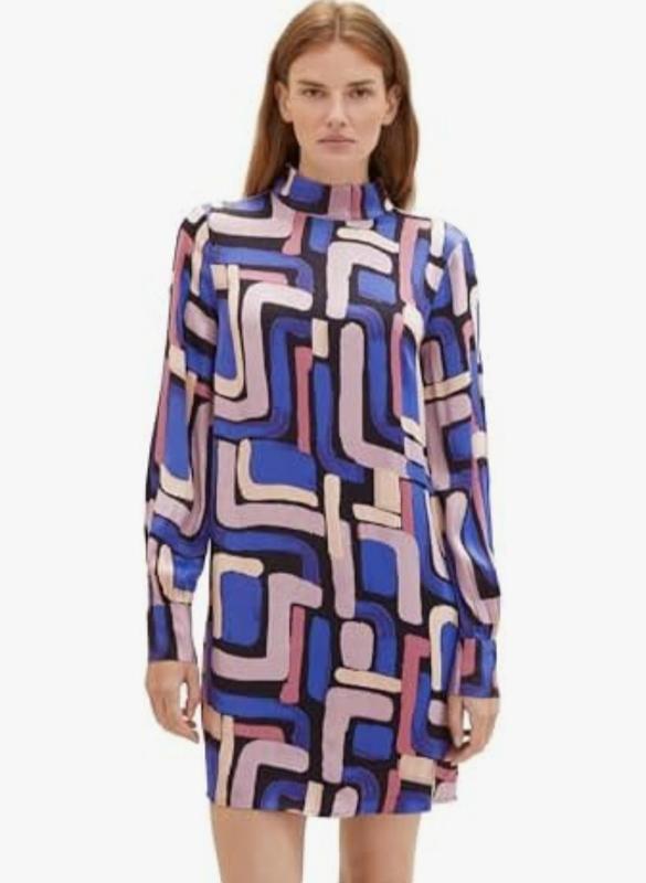 Яскрава сукня-сорочка від Tom Tailor привертає увагу своїм виразним, абстрактним геометричним принтом у відтінках синього, бузкового, рожевого та чорного. Сукня має довгий рукав на манжетах та елегантний високий комір-стійку з вирізом-краплею на спині. Виготовлена зі 100% віскози, вона забезпечує легкість та приємну на дотик текстуру, що ідеально підходить для створення комфортного, але стильного образу. Заміри: 42 розмір плечі - 44 пог-69 рукав -65 довжина -99 Розмір 38 плечі -40 пог- 52 рукав - 65 довжина -91