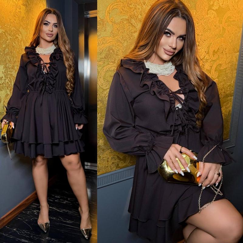 Жіноча красива сукня з рюшами Тканина: Софт, мʼякий приємний до тіла, не просвічується. З подвійною спідницею. Розмір 52-54, 56-58 Заміри: Параметри сукні (по готовому виробу): 0Г/ОТ/ОС: 52-54: 112-120/76/140 56-58: 122-130/80/150 Довжина сукні, довжина/ширина рукава: 52-54: 95; 72/52 56-58: 96; 74/56