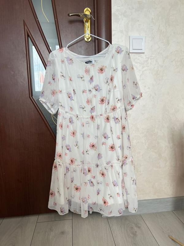 Платье с цветочным красивым принтом наденет 1 раз на весилку во время беременности. Ношу 44 размер на фото видно крупноватое поэтому подойдет на 46 как можно кстати замеры пишите Полуобхват по талии на платье 43см По бедрах полуобхват 70 Но платье без замка