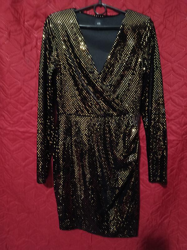 НОГ 40 - 45 см. НОТ 33 - 38 см. НОС 41 -50 см. . довжина 85 см. рукав 61 см. верх сукні іде на запах, а низ на одній стороні стяжка. тканина поліестер р-мір UK 8 EUR 34 Made in Maroco Ця сукня блистить мов золото - чудова нагода одягнути на Новий рік, чи дискотеку