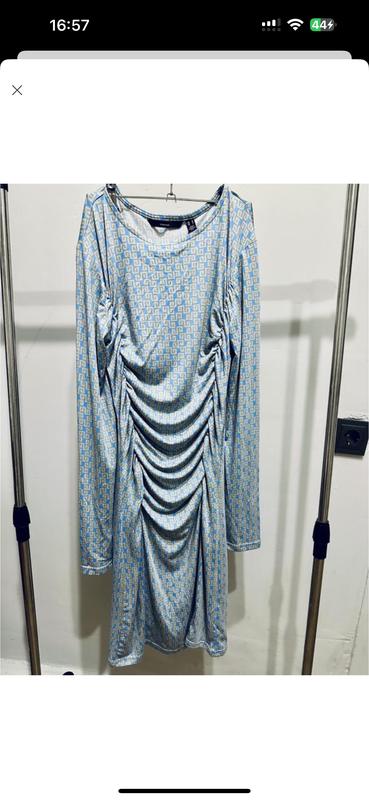 Елегантна блакитна сукня міді з довгими рукавами від бренду Vera Mods. Особливості: • Стильний світлий геометричний візерунок • Драпірування спереду створює ефект зборок • Матеріал: поліестер • Розміри: M, L • Стан: вживаний Сукня ідеально підходить для повсякденного носіння та особливих випадків. Геометричний принт додає сучасності, а драпірування створює жіночний силует.