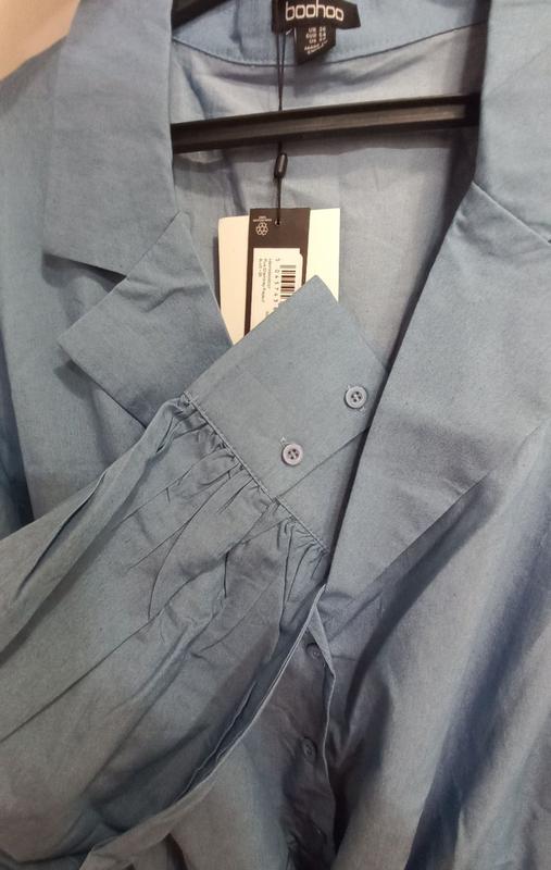 Великолепное летнее платье шортиками с манжетами голубого цвета, 56 размера, фирмы Boohoo. Зарекомендовало через интернет, не подходил размер. Ткань приятная 65% - коттон, 35 - полиэстер. Длина по спинке от воротника - 99см. Рукав от шва -67см. Талия 73см полуобхват - стягивается в поясе.