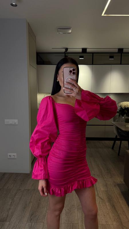 Рожева жіноча сукня міні ♥️ коротка вечірня сукня по фігурі з обʼємними рукавами ✨