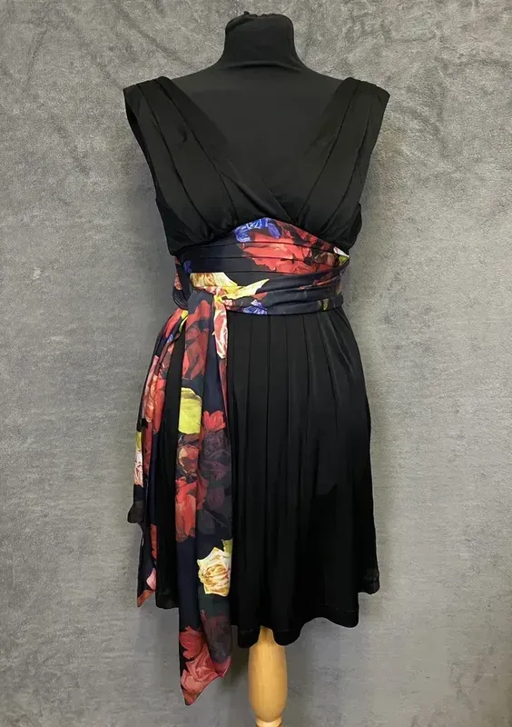 Шикарное платье👗 с V-образным вырезом и поясом в цветочный принт от всемирно известного люксового бренда Ted baker.😍 Платье имеет V-образный вырез спереди и сзади, на запах.Черный пояс в цветочный принт. Верхняя часть платья, на груди на подкладке, низ без подкладки.Черная ткань тянется, цветная нет.Сбоку скрытая молния.Знакомится очень красиво💖. Качество отличное. Размер указанный 2 замеры: Пог 42-47 см.(на запах, возможная грудь больше). Нежнейшего присборено на груди. Полуобхват места, когда цветная вставка 37 см. Длина 95 см. Без бумажной бирки. Обмена и возврат (мерки) нет