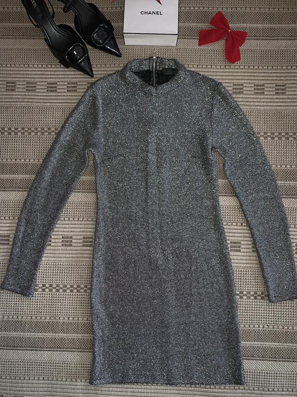 Міні сукня з люрексом , люрекс сам по собі виглядає дорого він такий як сітка але не колить ,з середини вона тепла є котон Приталеного силуету є виточки на груди Стан хороший Розмір Хс -С Тканина тягнеться Довжина 80 Довжина рукава 60 Груди 38 Талія 33 Бедра 37