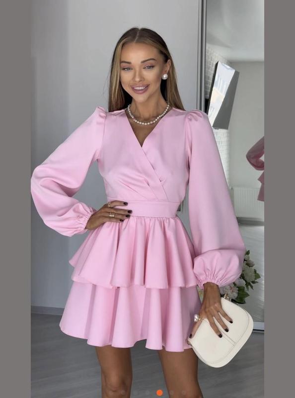 Стильна сукня, надягала 1 раз. Стан ідеальний. Ззаду пояс збирається в бантик. Параметри заявлені виробником: Обхват талії 72-80 см Обхват грудей 92-100 см Довжина рукава 71 Довжина сукні 86
