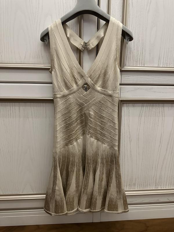 Сукня вишукана тепло-золотистого кольору, S - розмір, тканина - тягнеться, дуже гарно по фігурі сидить, підкреслює гарно і груди і талію, хто знає цей бренд , бандажний крій, той знає - перевірену якість. Коротка, вище колін. В прекрасному стані, одягала всього один раз на захід. І ціна - далека від першої вартості;))