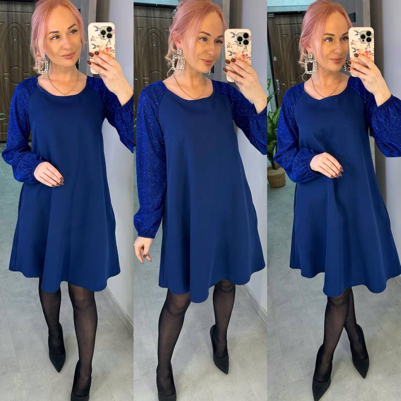 Праздничное платье Модель 907 Ткань: костюмка и рукав люрекс Размеры: 42-44, 46-48,50-52 Цвета: синий С боковыми карманами Платье, которое подойдет каждой и скроет все недостатки фигуры