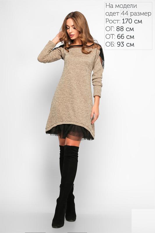 Красивое трикотажное платье с люрексом, двойным воланом из сетки спереди снизу и с очень красивым объемным кружевом на сетке сверху рукава. Блеск люрекса не сильный, деликатный. Оригинальный крой, где кокетка из сетки переходит в рукава, а двойной волан по низу переда вшит в полукруглый вырез на подоле. Платье на холодное время года, с длинным рукавом. Без застежки, но легко одевается благодаря тянущемуся трикотажу и силуэту трапеции. Размер: 48 (UKR) Ткань: трикотаж с люрексом, сетка, кружево. Цвет: бежевый и при дневном свете отдает немного в розовый (на фото не передается фактический цвет, хоть я и фотографировала ткань при дневном и вечернем освещении). Фактические измерения: Полуобъем груди - 45 см (тянется до 49 см) Полуобъем талии - 43 см (тянется до 47 см.) Полуобъем бедер - 49 см (тянется до 53 см.) Длина рукава от горловины (попадает с плечом) - 71 см Длина платья - 90 см.