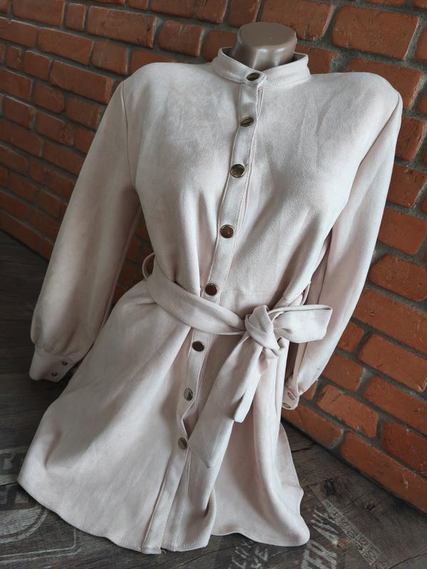 Все кнопки рабочие. Имеет поясок. Внутренняя сторона гладкая, приятная к телу. Бирки со составом нет. Достаточно плотная, но не толстая. Очень приятный гладкий велюр. Подойдет на невысокий рост. Ворота – стойка. Цвет - пудра. Указан размер М Длина 78, плечи 40, рукав от плеча 56, подмышки 48-55, пояс 42 (регулируется поясом), бедра свободные ❗Имеет поверхностное загрязнение от перевозки