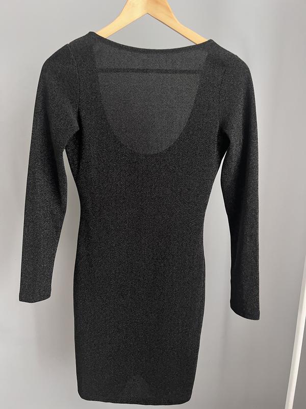 Коротка приталена сукня, чорного кольору з блиском, H&M, розмір S, стан ідеальний. Довжина 85 см, довжина рукава 59 см, півобхват грудей 38 см, півобхват талії 32 см, півобхват бедер 40 см. Тканина тягнеться, немає додаткової підкладки. Має неглибокий круглий виріз на спині,