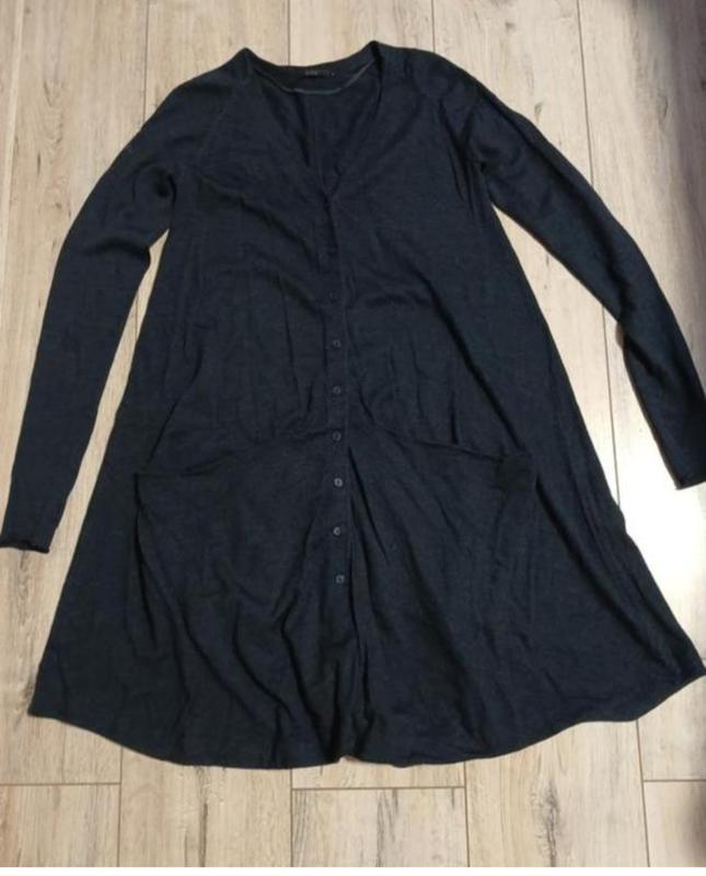 Стильное женское шерстяное платье -кардиган,бренду Cos, размер XS. В идеальном состоянии, есть небольшой дефект сбоку слева по спинке, как будто зацепка, еле заметно,видно на последнем фото. Можно носить как платье и кардиган, красивое качество,приятная ткань, глубокий синий цвет. Замеры делались не в натяжку ткань еще тянется Замеры: Плечи регланом, По грудях 46см. Талия 49см. свободного кроя Бедра свободного кроя 60см. Длина 95см. Длина рукава от горловины 75см.