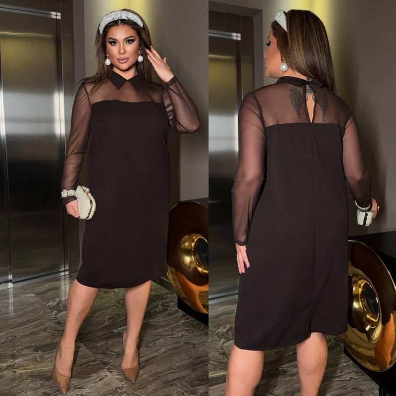 Сукня Розміри : 50-52 , 54-56 , 58-62 Тканина : якісна сітка + креп дайвінг Кольори : чорний ,шоколад Елегантність, що говорить сама за себе Відкрийте для себе сукню, створену для особливих моментів. Ніжні напівпрозорі рукави, витончений комір , бездоганний силует ,та грайливий розріз роблять цей образ ##_ідеальним вибором для вечірніх виходів, романтичних зустрічей і стильних подій. Ціна: 820 грн