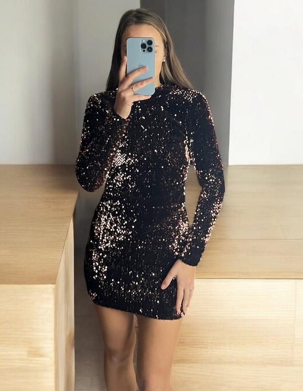Неймовірно красива і стильна сукня в паєтках, з відкритою спинкою. Паєтки бордово-коричневого кольору з золотим відтінком. Стан абсолютно нової. Ідеально підійде на розмір XS. Заміри: Довжина 81 см Довжина рукава 58 см Напівобхват грудей 38 см Напівобхват талії 31.5 см Напівобхват стегон 38 см.